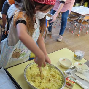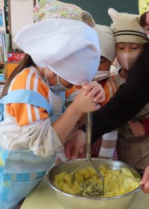 つぶしたさつまいもが熱いうちに牛乳・マーガリン・砂糖・生クリームを加え、「おいしくなーれ!」とおまじないしながら、成形できる位のなめらかさになるまで混ぜました。