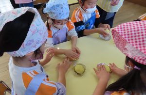 全部混ざったところで、次は丸めていきます!「やわらかーい!」「あったかーい!」感触を感じながら、手で上手に丸めました。丸くコロコロ形を整えて、アルミカップにのせ、すぐに食べたいところですが…