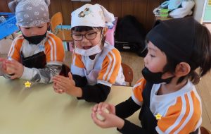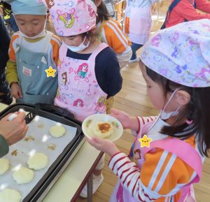 お友だちそれぞれが好きな形に整えて、こんがり色がつくまでホットプレートで「おいしくなーれ!」と言いながら焼きました♪