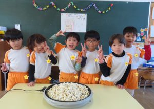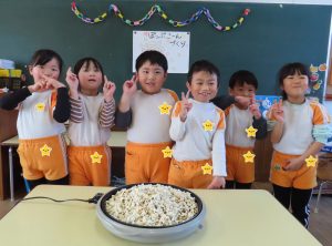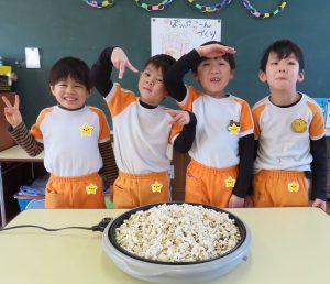 そらぐみ・つきぐみのお友だちは、いつも食べているポップコーンがどんな風に出来るのか⁈クッキングを通して、食の楽しさを学びました。